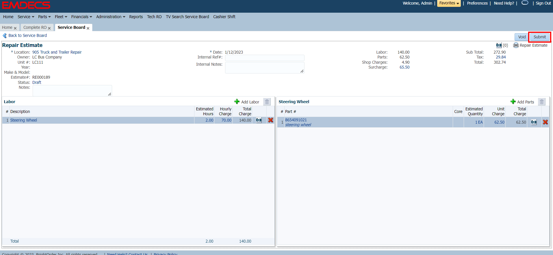 Estimates need to be approved, as a way of telling the EMDECS system that your customer has approved the work and it can be linked to the unit. Click the estimate number on the Service Board to review and approve your new estimate.