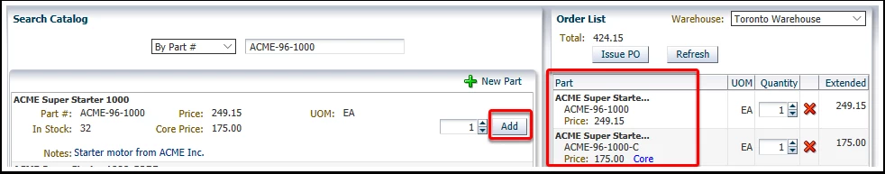 If you select the option to create a new core part, then fill out the form to add a new part number as the core for the main park. Click Link Core at the bottom of the screen to add the part and complete the core linkage.Below are examples of how core part transactions are handled in EMDECS:Whenever a part with a core is added to a repair order, counter sale, or purchase order, both the main part and the core part will be added together at the same time.To return a core part, add it to the same order and the system will detect it is a core and defaults to performing a core return (adds the part with a negative quantity, -1, to credit back for the return of the core.Adding a part linked to a core on a counter sale results in both the main part and core part being listed. When a core is added, counter sales also default to the core return option, as pictured below.Pictured below is an example of adding the main part to a part purchase order. Both the main part and core are added to the order list.