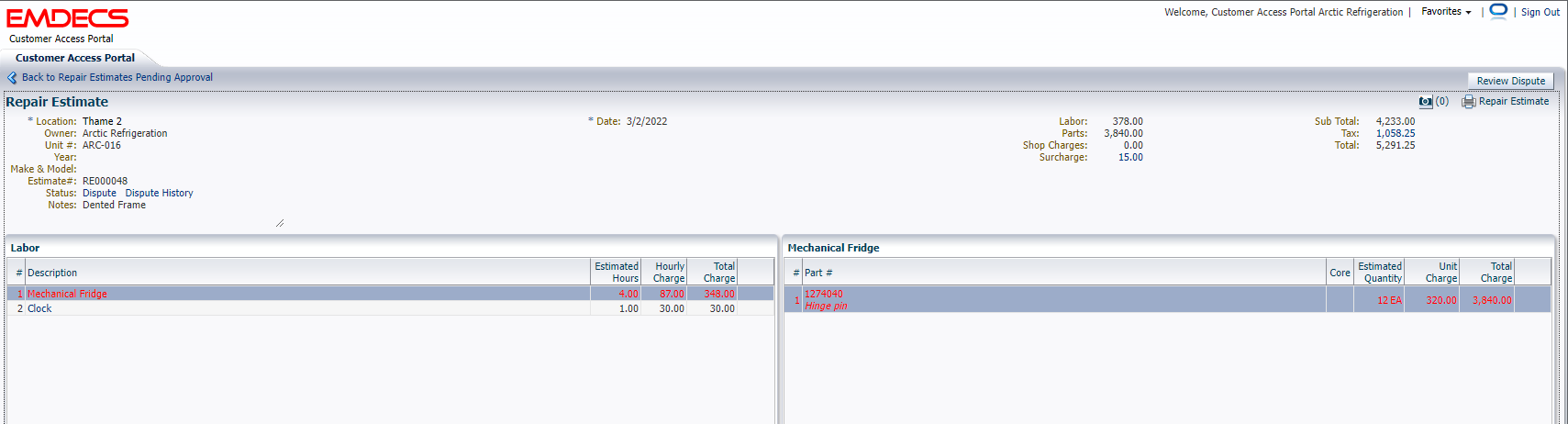 Dispute - Customers will be able to dispute individual Labour and Parts on the Estimate