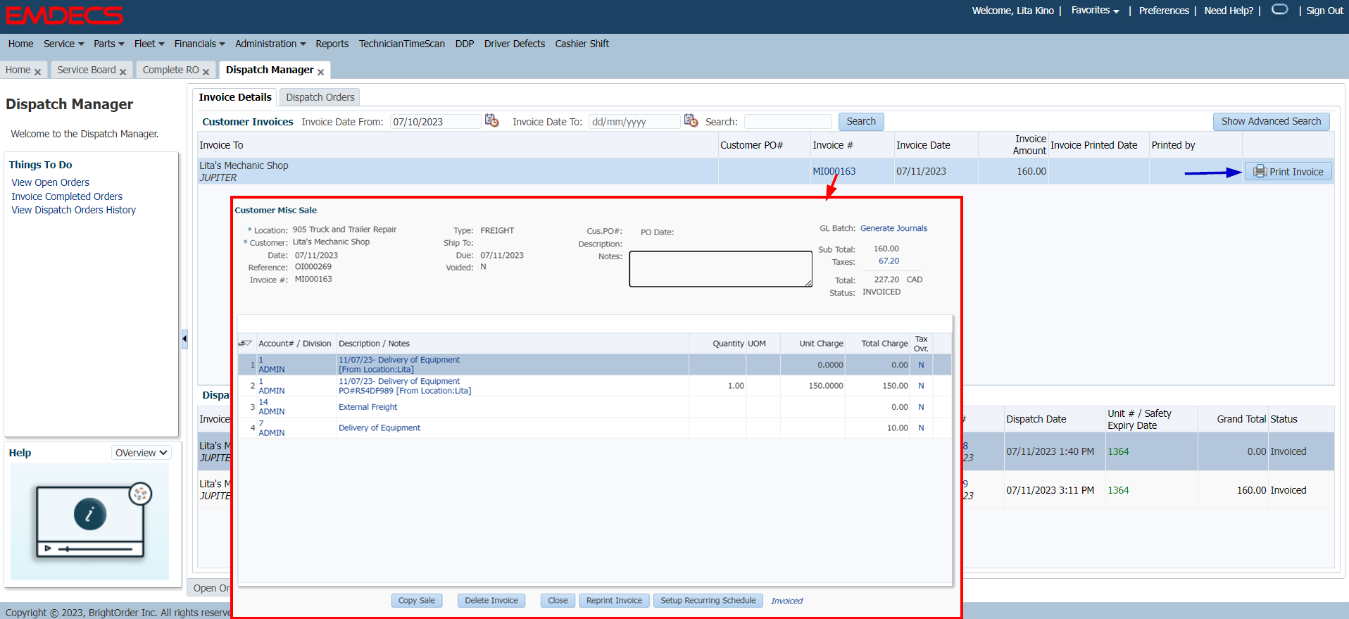 If multiple Dispatched Orders are attached to the Invoice, they are displayed in the bottom pane once the line is highlighted.