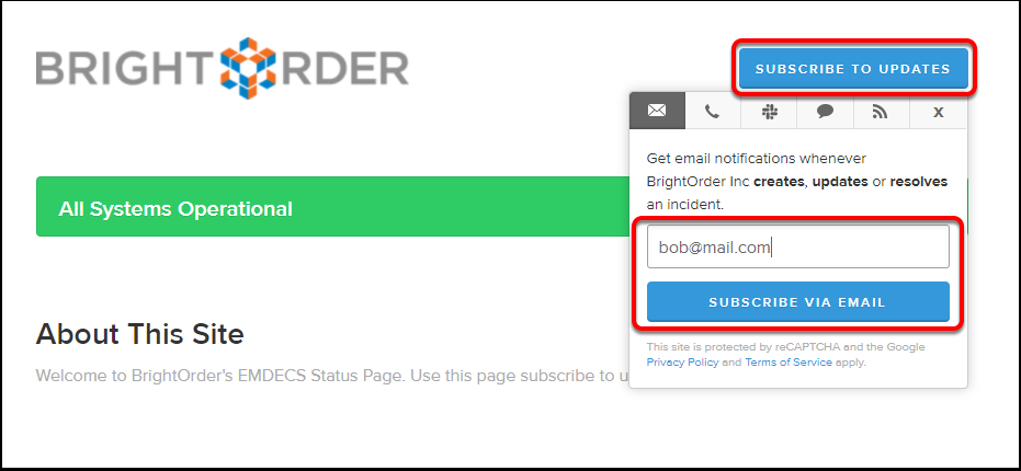 To receive email updates whenever we post a system status announcement or update, click on SUBSCRIBE TO UPDATES then enter your email address and click SUBSCRIBE VIA EMAIL.