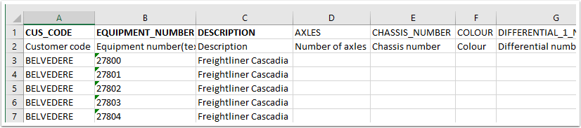 3. Populate the download template with the unit list. Columns with bold headings (Customer Code, Equipment number, and Description) are required. Cells left blank will not be uploaded or change existing records.