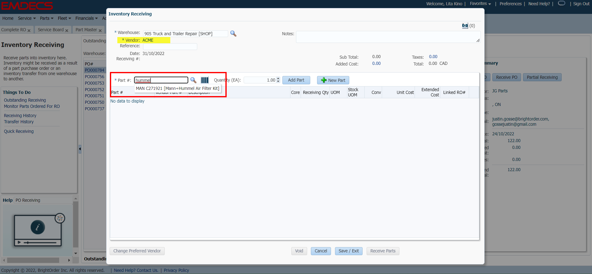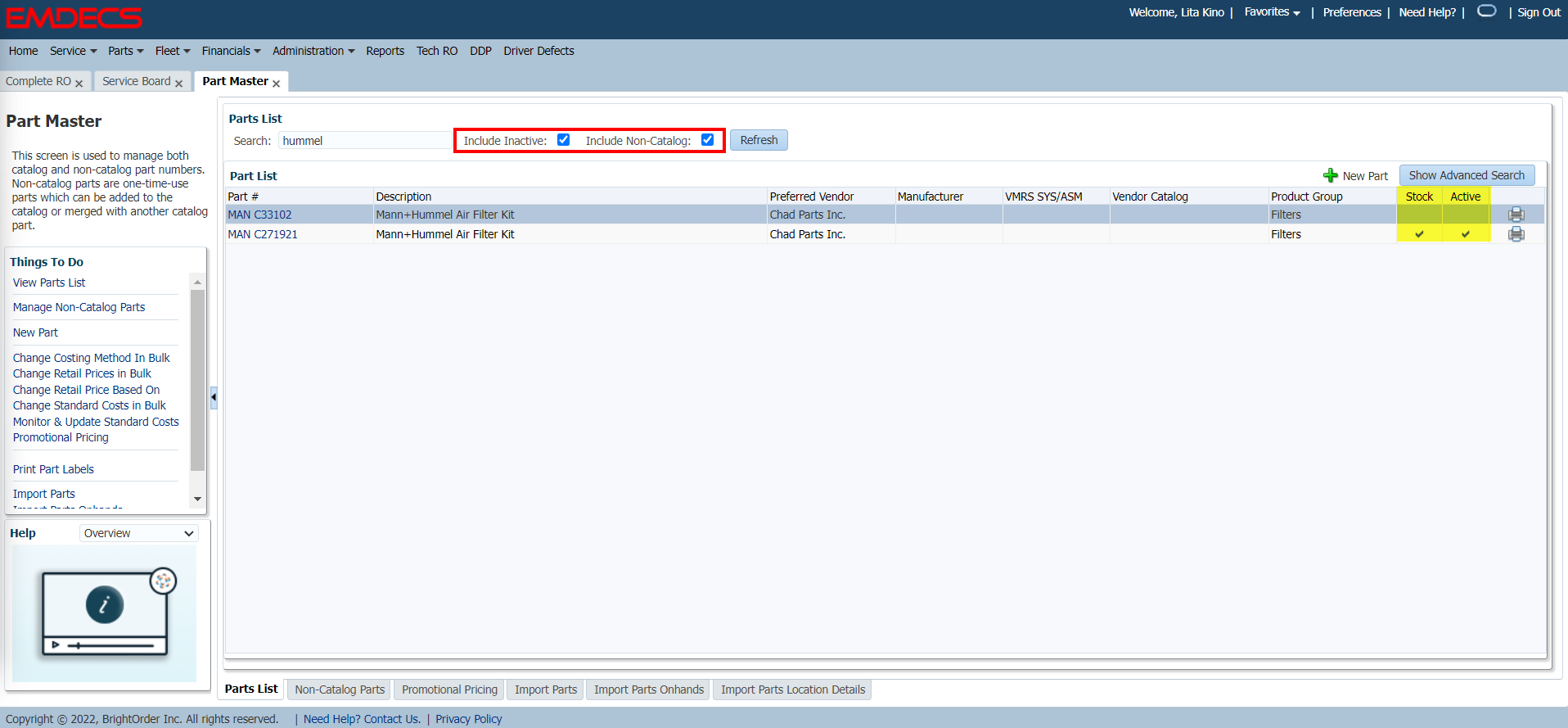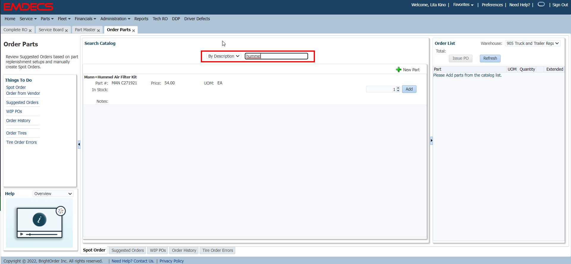 Using the Description to search by, any Active Parts will be displayed to be ordered