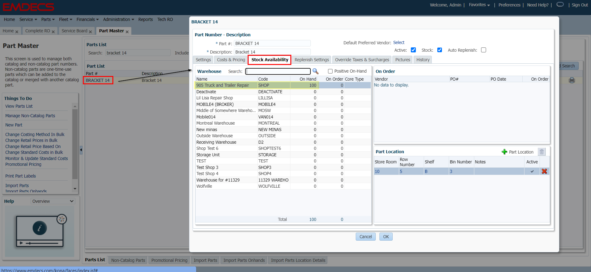 13. You can double check the import was successful by going to the Parts List. Search for a Part Number and go to the Stock Availability tab.