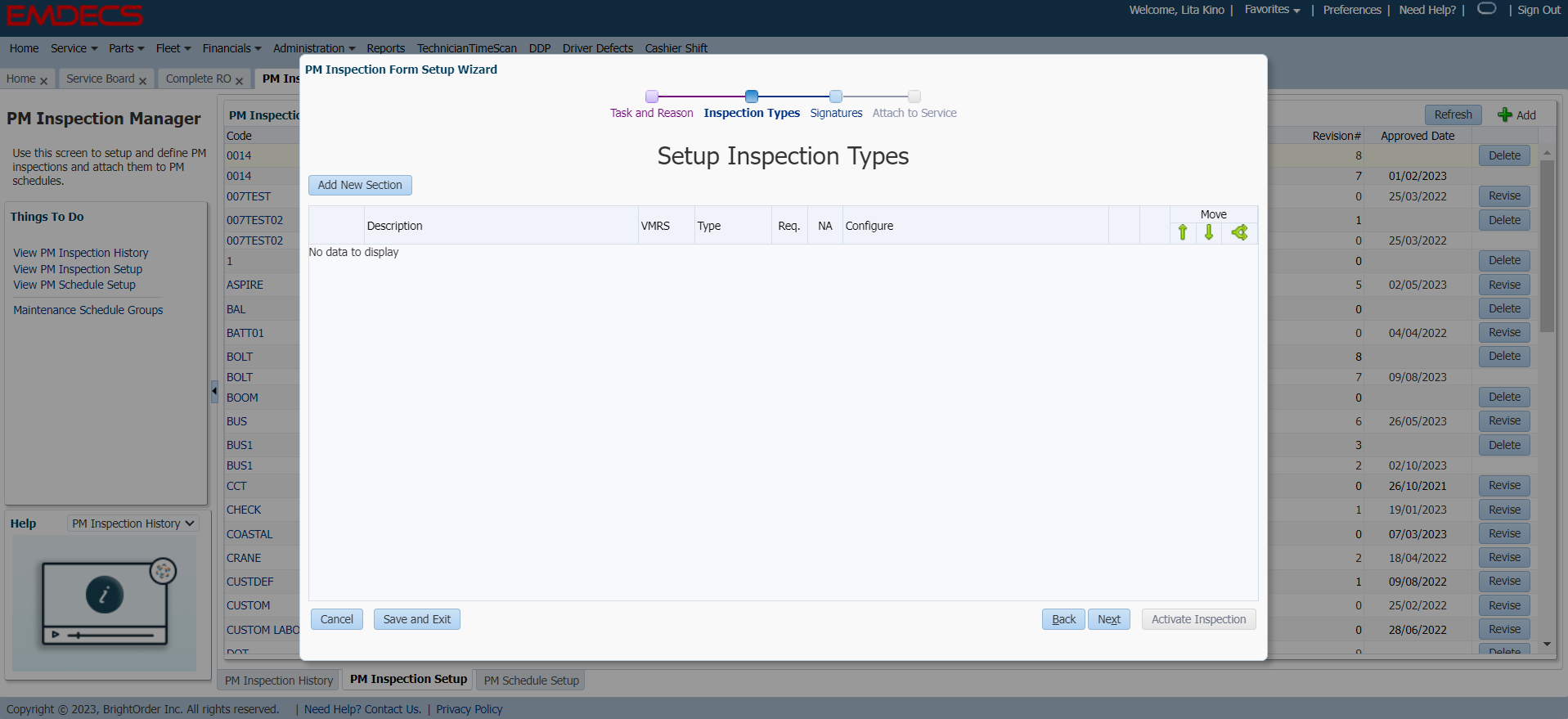 Click +Add to have the wizard appear. Enter a Code and Description for the Inspection Form. The Task and Reason for the checklist can be hardcoded from here.