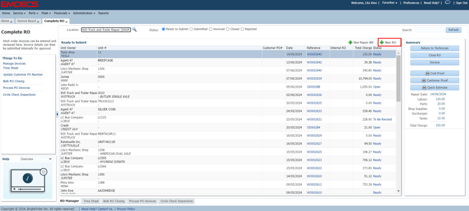 Service-> Complete RO-> + New RO