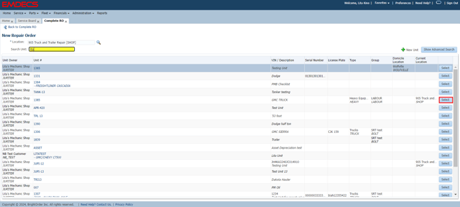 Find the Unit to enter the work on.
