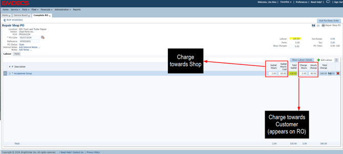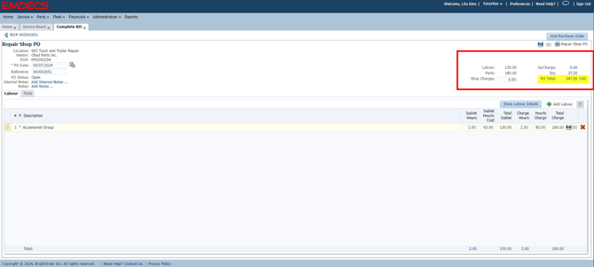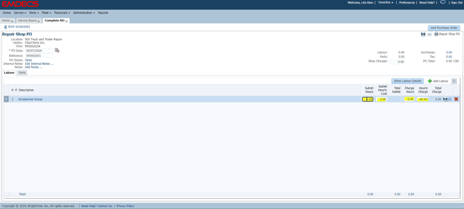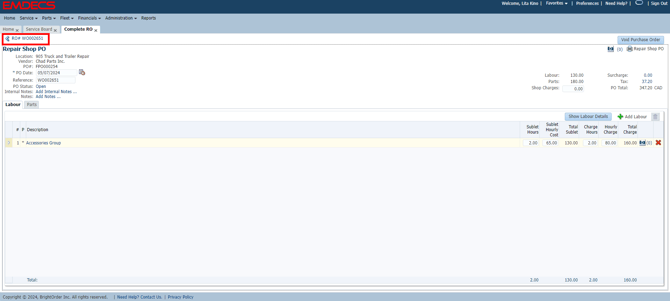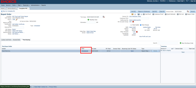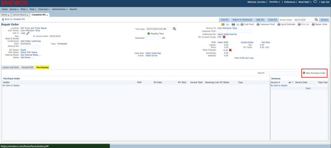 If any of the work is being done in shop, enter this information under the Labour and Parts tab. To enter the Sublet work, click on the Purchasing tab. To create a new PO, click on +New Purchase Order