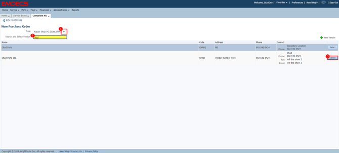 Using the Dropdown, select Repair Shop PO (Sublet PO) and search for your Vendor. Press Select