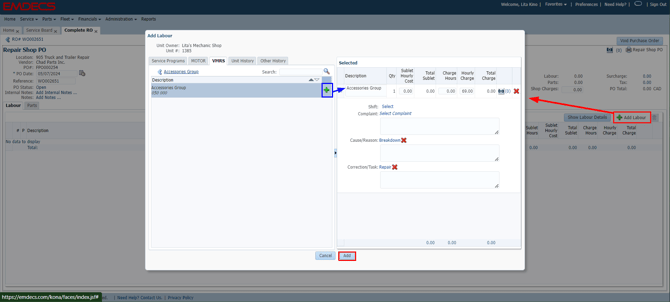 Click +Add Labour and select the appropriate VMRS codes. When finished, click Add