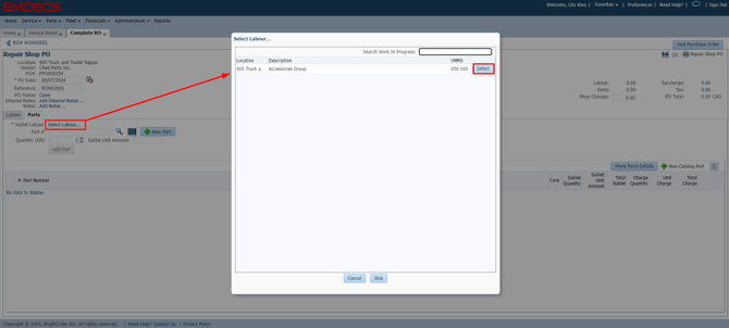 Parts must always be attached to a Labour Line on Repair Orders. Press Select Labour in order to choose from any available labour on the RO