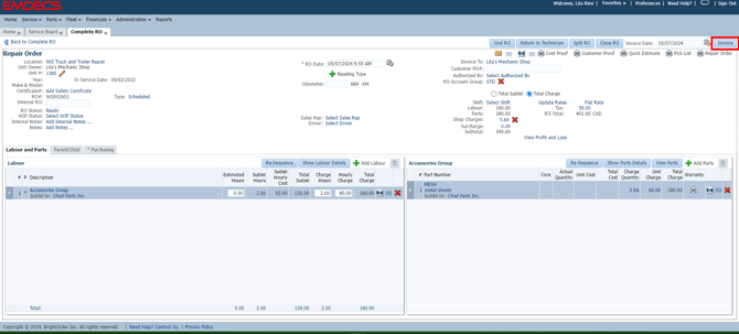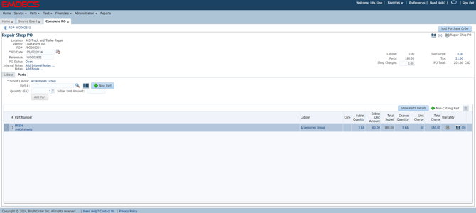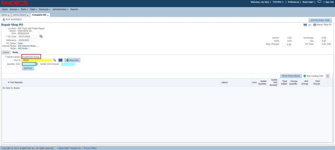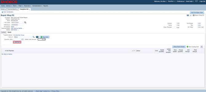 The Labour will now show. Enter your Part # - the Part must exist in Part Master whether you stock it or not to use on an RO. Use the +New Part button to create the Part in EMDECS.
