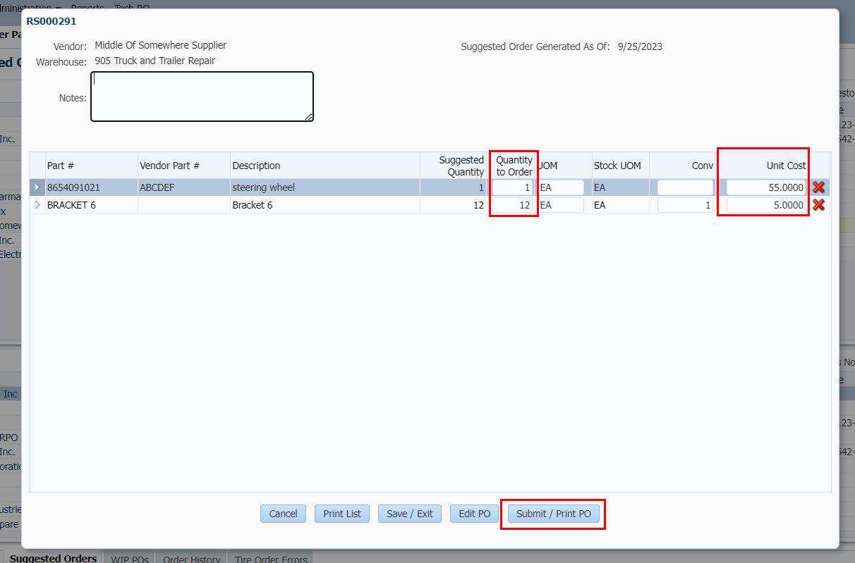 6. In this screen, you can change the Order Quantity and the Unit Cost. If you don't need to add anything else to the PO you can submit the PO by clicking Submit/Print PO.