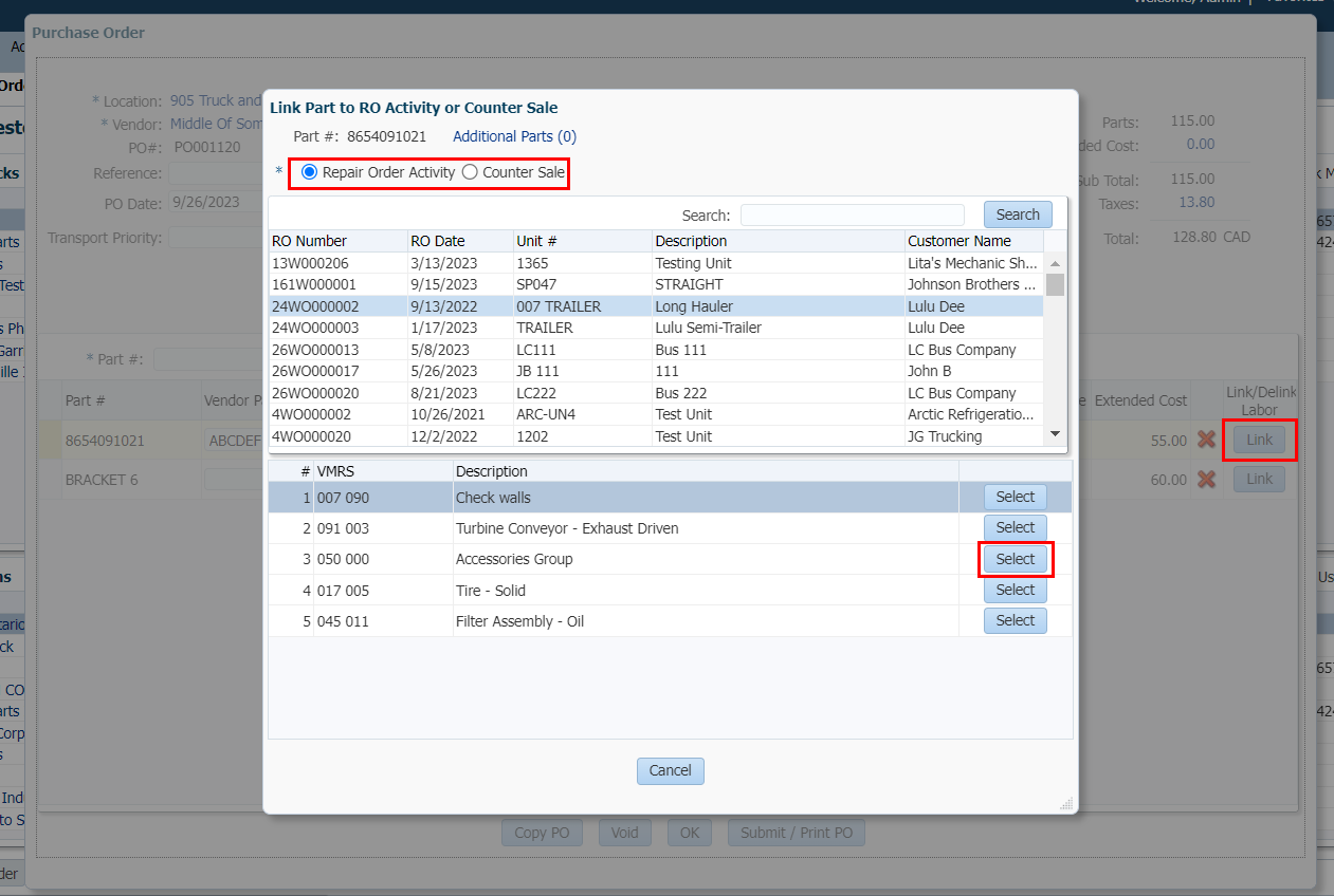 9. To link any of the parts to a counter sale or a repair order activity click on the Link button. You can use the radio buttons to view the Repair Orders or counter sales. Click Select when you find the VMRS or counter sale you want to link the part to.
