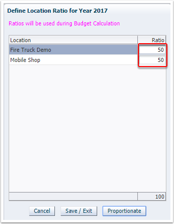 - After clicking on Define Location Ratio , enter the ratio for each location or use the Proportionate button to split the budget evenly for each location.