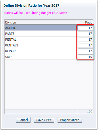 - The Define Division Ratio pop-up screen lists all business divisions in EMDECS. Enter a ratio in each field, or click the Proportionate button to automatically spread the budget evenly. Click Save / Exit to close the screen and save the ratios.